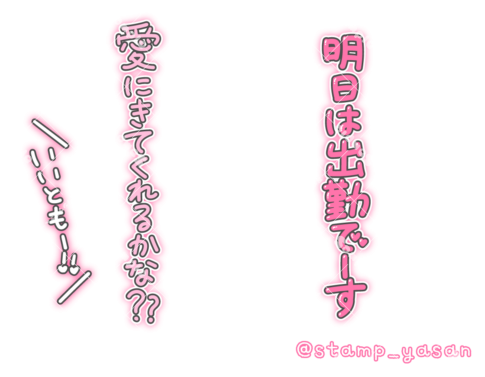 「明日は出勤でーす 愛にきてくれるかな?? いいともー!!」の縦書きスタンプ