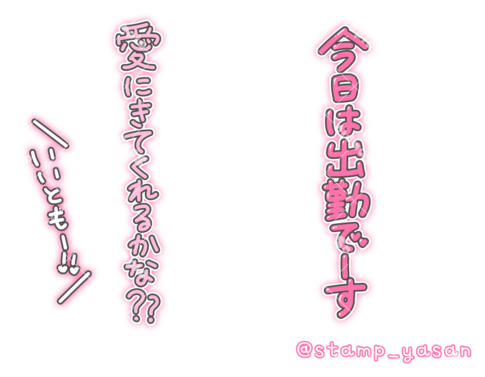 「今日は出勤でーす 愛にきてくれるかな?? いいともー!!」の縦書きスタンプ
