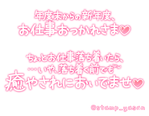 「年度末からの新年度、お仕事おつかれさま」「ちょっとお仕事落ち着いたら、…いや、落ち着く前でもww癒やされにおいでませ」のスタンプ