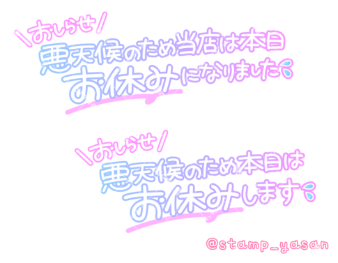 「悪天候のため当店は本日お休みになりました」「悪天候のため本日はお休みします」のスタンプ