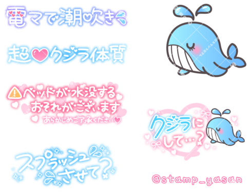 「電マで潮吹き」「超クジラ体質」「ベッドが水没するおそれがございます」「スプラッシュさせて?」「クジラにして…?」のスタンプ