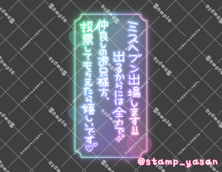 「ミスヘブン出場します!!出るからには全力で 仲良しのお兄様方、投票してもらえたら嬉しいです」のスタンプ(縦書き)