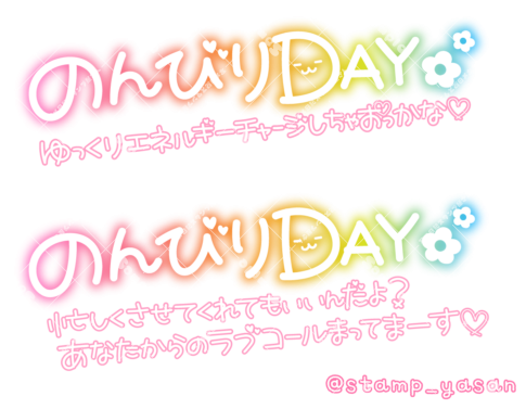 「のんびりDAY ゆっくりエネルギーチャージしちゃおうかな」「のんびりDAY 忙しくさせてくれてもいいんだよ?あなたからのラブコールまってまーす」のスタンプ