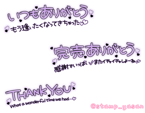 「いつもありがとう もう逢いたくなってきちゃった」「完売ありがとう 感謝でいっぱい またイチャイチャしよーね」「THANK YOU What a wonderful time we had…」のスタンプ