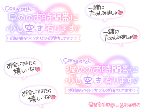 「Come on!! 早め(遅め)のお時間帯に少し空き有ります」「一緒にたのしみましょ」「お会いできたら嬉しいな」のスタンプ