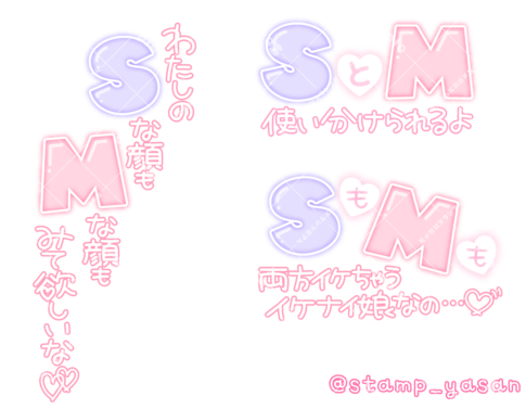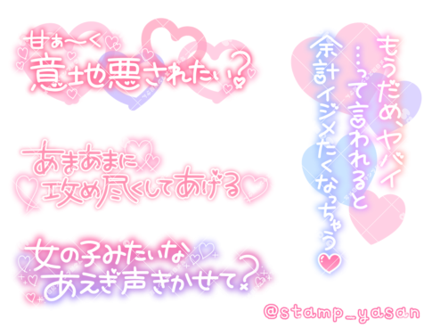 「甘ぁ〜く意地悪されたい?」「あまあまに攻め尽くしてあげる」「女の子みたいなあえぎ声きかせて?」「もうだめ、ヤバイ…って言われると余計イジメたくなっちゃう」のスタンプ(縦書き有)