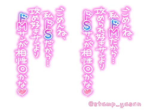 「ごめんね、私ドM(S)だから…攻められ好きサン(攻め好きサン)よりドS(M)サンが相性◎かな」のスタンプ(縦書き)
