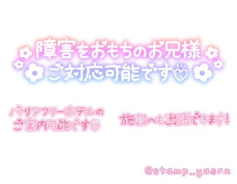 「障害をおもちのお兄様ご対応可能です」「バリアフリーホテルのご案内可能です」「施設へも出張できます!」のスタンプ