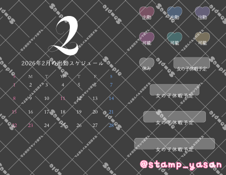 2026.01.19PR2026年2月のシンプルカレンダー 透かしなしのスタンプは会員登録でご利用できます♡素材はログイン後「協賛店舗様」広告下に表示されます。会員様はログイン状態で画面を少しスクロールして本素材を表示・保存してください。 広告掲載しませんか?詳細はこちら 協賛店舗様 【写メ日記代行】 Nさぽ ダイリー(写メ日記自動作成アプリ) コンテンツの残りを閲覧するにはログインが必要です。 お願い Log In. あなたは会員ですか ? 会員について