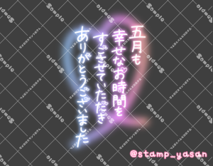 「五月も幸せなお時間をすごさせていただきありがとうございました」のスタンプ 2023 5/25 2023年5月25日 0 こちらの画像はサンプルです。保存やSNS等への掲載はご遠慮ください。会員登録・ログイン後に表示される『本画像』をダウンロードしてご利用ください。 用途あいさつ月末・月初のあいさつカラータグありがとう5月 ありがとう 5月 文字 敬語 縦書き 透過 この記事が気に入ったら フォローしてね! Follow @stamp_yasan_sub Follow me! 「なかよしの社長様いつもありがとう」のスタンプ 「5月は沢山愛してくれてありがとう」のスタンプ