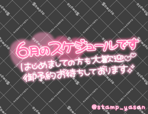 「6月の予定 Checkしてね」のスタンプ 2024 5/14 2024年5月14日 0 こちらの画像はサンプルです。保存やSNS等への掲載はご遠慮ください。会員登録・ログイン後に表示される『本画像』をダウンロードしてご利用ください。 用途あいさつ月末・月初のあいさつカラータグ6月 6月 文字 タメ語 横書き 透過 この記事が気に入ったら フォローしてね! Follow @stamp_yasan_sub Follow me! 「6月のスケジュールです はじめましての方も大歓迎 御予約お待ちしております」のスタンプ 「移籍のおしらせ 心機一転がんばります 新しいわたしに愛にきてね」のスタンプ