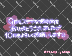 「9月もステキなお時間をありがとうございました 10月もよろしくお願いします!!」のスタンプ 2023 9/30 2023年9月30日 0 こちらの画像はサンプルです。保存やSNS等への掲載はご遠慮ください。会員登録・ログイン後に表示される『本画像』をダウンロードしてご利用ください。 用途あいさつ月末・月初のあいさつカラータグよろしくお願いします10月9月ありがとう よろしくお願いします 10月 9月 ありがとう 文字 敬語 横書き 透過 この記事が気に入ったら フォローしてね! Follow @stamp_yasan_sub Follow me! 「選び方の目安を日記に書いたから参考にしてね」のスタンプ 「9がつもありがとう」のスタンプ