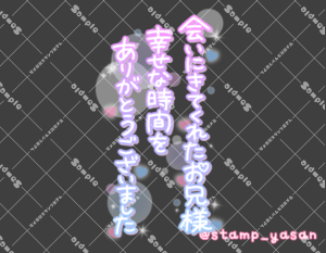 「会いにきてくれた王子様幸せな時間をありがとうございました」のスタンプ 2023 7/25 2023年7月25日 0 こちらの画像はサンプルです。保存やSNS等への掲載はご遠慮ください。会員登録・ログイン後に表示される『本画像』をダウンロードしてご利用ください。 用途予約・来店へのお礼お礼・感謝カラータグありがとう王子様 ありがとう 王子様 文字 敬語 縦書き 透過 この記事が気に入ったら フォローしてね! Follow @stamp_yasan_sub Follow me! 「会いにきてくれたお兄様幸せな時間をありがとうございました」のスタンプ 「今日もおつかれ様 がんばったごほうびにいっぱい甘やかしてあげるね」のスタンプ