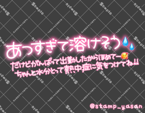 「あつすぎて溶けそう💧だけどがんばって出勤したからほめてー🥰ちゃんと水分とって熱中症に気をつけてね!!」のスタンプ 2025 6/23 2025年6月23日 0 こちらの画像はサンプルです。保存やSNS等への掲載はご遠慮ください。会員登録・ログイン後に表示される『本画像』をダウンロードしてご利用ください。 用途季節・イベント出勤・退勤春夏秋冬天候・気温出勤・退勤・お誘いカラータグ出勤暑い夏 出勤 暑い 夏 文字 タメ語 横書き 透過 この記事が気に入ったら フォローしてね! Follow @stamp_yasan_sub Follow me! 「ぜんぶ、君の好きにしていいよ?」のスタンプ 「今からお店向かうよ♡楽しい時間が沢山すごせますように」のスタンプ