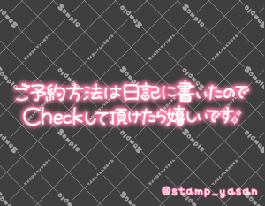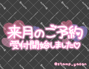 「ご予約方法は日記に書いたのでCheckして頂けたら嬉しいです」のスタンプ 2023 12/18 2023年12月18日 0 こちらの画像はサンプルです。保存やSNS等への掲載はご遠慮ください。会員登録・ログイン後に表示される『本画像』をダウンロードしてご利用ください。 用途スケジュール・予約予約受付中・予約の説明カラータグ予約 予約 文字 敬語 横書き 透過 この記事が気に入ったら フォローしてね! Follow @stamp_yasan_sub Follow me! 「来月のご予約受付開始しました」のスタンプ 「おきゅいん」のスタンプ