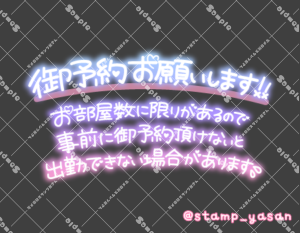「御予約お願いします!!お部屋数に限りがあるので事前に御予約頂けないと出勤できない場合があります」のスタンプ 2023 9/16 2023年9月16日 0 こちらの画像はサンプルです。保存やSNS等への掲載はご遠慮ください。会員登録・ログイン後に表示される『本画像』をダウンロードしてご利用ください。 用途予約受付中・予約の説明スケジュール・予約カラータグ予約 予約 文字 敬語 横書き 透過 この記事が気に入ったら フォローしてね! Follow @stamp_yasan_sub Follow me! 「おはよー 今日も1日がんばろー!!」のスタンプ 「THANK YOU この広大なネットの海で私をみつけてくれたのはもはや運命…!!」のスタンプ