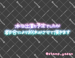 「本日お休みさせて頂きます」のスタンプ 2023 9/04 2023年9月4日 0 こちらの画像はサンプルです。保存やSNS等への掲載はご遠慮ください。会員登録・ログイン後に表示される『本画像』をダウンロードしてご利用ください。 用途おわび遅刻・欠勤・早退カラータグ本日欠勤 本日 欠勤 文字 敬語 横書き 透過 この記事が気に入ったら フォローしてね! Follow @stamp_yasan_sub Follow me! 「優しくしてね」のスタンプ 「本日出勤予定でしたが都合によりお休みさせて頂きます」のスタンプ