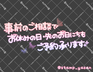 「事前のご相談でお休みの日・先のお日にちもご予約承ります」のスタンプ 2025 7/23 2025年7月23日 0 こちらの画像はサンプルです。保存やSNS等への掲載はご遠慮ください。会員登録・ログイン後に表示される『本画像』をダウンロードしてご利用ください。 用途スケジュール・予約予約受付中・予約の説明カラータグ姫予約予約リクエスト出勤蝶 姫予約 予約 リクエスト出勤 蝶 文字 敬語 横書き 透過 この記事が気に入ったら フォローしてね! Follow @stamp_yasan_sub Follow me! 「とろとろ」のスタンプ 「姫予約の方限定 浴衣でお出迎え」のスタンプ