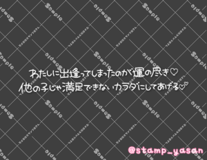 「君の🍌にロックオン」のスタンプ 2025 9/02 2025年9月2日 0 こちらの画像はサンプルです。保存やSNS等への掲載はご遠慮ください。会員登録・ログイン後に表示される『本画像』をダウンロードしてご利用ください。 カラータグ変態 変態 文字 タメ語 横書き 透過 この記事が気に入ったら フォローしてね! Follow @stamp_yasan_sub Follow me! 「わたしに出逢ってしまったのが運の尽き♡他の子じゃ満足できないカラダにしてあげる♡」のスタンプ 「いちゃいちゃばちぼこ…しよっか////」のスタンプ