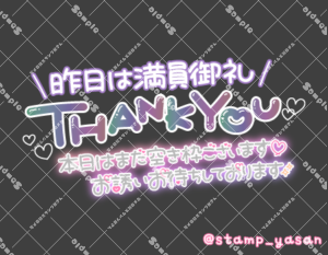 「昨日は満員御礼THANK YOU♡本日はまだ空き枠ございます♡お誘いお待ちしております」のスタンプ 2025 1/27 2025年1月27日 0 こちらの画像はサンプルです。保存やSNS等への掲載はご遠慮ください。会員登録・ログイン後に表示される『本画像』をダウンロードしてご利用ください。 用途お礼・感謝出勤・退勤・お誘いスケジュール・予約お礼・感謝全般予約・来店へのお礼お誘い・待機中空き状況・受付終了カラータグありがとう待ってる本日お誘い満員御礼空き枠昨日 ありがとう 待ってる 本日 お誘い 満員御礼 空き枠 昨日 文字 敬語 横書き 透過 この記事が気に入ったら フォローしてね! Follow @stamp_yasan_sub Follow me! 「みつけてくれてTHANK YOU 今日も素敵なお兄様と出逢えたらいいな♡」のスタンプ 「2月もあなたのコト待ってるね」のスタンプ