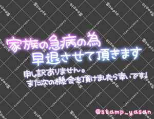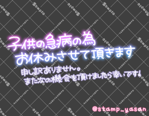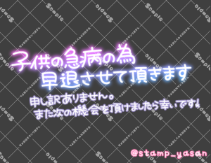 「子供の急病の為お休みさせて頂きます 申し訳ありません。また次の機会を頂けましたら幸いです!」のスタンプ 2024 9/06 2024年9月6日 0 こちらの画像はサンプルです。保存やSNS等への掲載はご遠慮ください。会員登録・ログイン後に表示される『本画像』をダウンロードしてご利用ください。 用途遅刻・欠勤・早退おわびカラータグ家庭の事情欠勤 家庭の事情 欠勤 文字 敬語 横書き 透過 この記事が気に入ったら フォローしてね! Follow @stamp_yasan_sub Follow me! 「家族の急病の為早退させて頂きます 申し訳ありません。また次の機会を頂けましたら幸いです!」のスタンプ 「子供の急病の為早退させて頂きます 申し訳ありません。また次の機会を頂けましたら幸いです!」のスタンプ