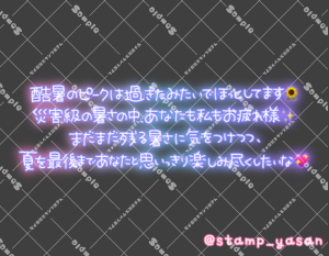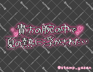 「酷暑のピークは過ぎたみたいでほっとしてます🌻災害級の暑さの中、あなたも私もお疲れ様✨まだまだ残る暑さに気をつけつつ、夏を最後まであなたと思いっきり楽しみ尽くしたいな💖」のスタンプ 2025 8/08 2025年8月8日 0 こちらの画像はサンプルです。保存やSNS等への掲載はご遠慮ください。会員登録・ログイン後に表示される『本画像』をダウンロードしてご利用ください。 用途季節・イベント春夏秋冬天候・気温カラータグおつかれさま暑い夏酷暑残暑 おつかれさま 暑い 夏 酷暑 残暑 文字 敬語 横書き 透過 この記事が気に入ったら フォローしてね! Follow @stamp_yasan_sub Follow me! 「あなたとすごす時間はあまりにあっという間で儚くてまるで線香花火のよう…」のスタンプ 「貴方の腕の中で夏の熱に浮かされたい」のスタンプ