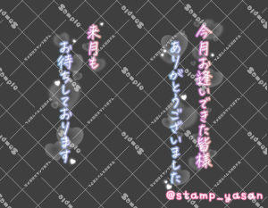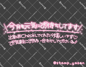 「今月もTHANK YOU」のスタンプ 2025 3/24 2025年3月24日 0 こちらの画像はサンプルです。保存やSNS等への掲載はご遠慮ください。会員登録・ログイン後に表示される『本画像』をダウンロードしてご利用ください。 用途あいさつ月末・月初のあいさつカラータグ英語今月ありがとう 英語 今月 ありがとう 文字 タメ語 横書き 透過 この記事が気に入ったら フォローしてね! Follow @stamp_yasan_sub Follow me! 「今月も元気にお待ちしてます 出勤表Checkしてくれたら嬉しいです♡お気軽にお問い合わせしてくださいね」のスタンプ 「今月お逢いできた皆様ありがとうございました」「来月もお待ちしております」のスタンプ
