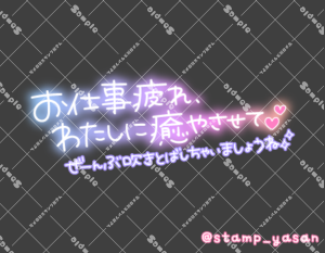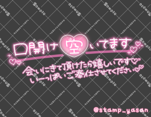 「口開け空いてます♡会いにきて頂けたら嬉しいです♡いーっぱいご奉仕させてください♡」のスタンプ 2025 9/29 2025年9月29日 0 こちらの画像はサンプルです。保存やSNS等への掲載はご遠慮ください。会員登録・ログイン後に表示される『本画像』をダウンロードしてご利用ください。 用途出勤・退勤・お誘いスケジュール・予約お誘い・待機中空き状況・受付終了カラータグスタートご奉仕空き枠 スタート ご奉仕 空き枠 文字 敬語 横書き 透過 この記事が気に入ったら フォローしてね! Follow @stamp_yasan_sub Follow me! 「お仕事疲れ、わたしに癒やさせて♡ぜーんぶ吹きとばしちゃいましょうね」のスタンプ 「出勤しました 本日もよろしくお願いします」のスタンプ