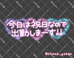 「今日は祝日ですが出勤しまーす!!」のスタンプ 2024 2/22 2024年2月22日 0 こちらの画像はサンプルです。保存やSNS等への掲載はご遠慮ください。会員登録・ログイン後に表示される『本画像』をダウンロードしてご利用ください。 用途出勤・退勤週末・週初めのあいさつ出勤・退勤・お誘いあいさつカラータグ本日出勤祝日 本日 出勤 祝日 文字 敬語 横書き 透過 この記事が気に入ったら フォローしてね! Follow @stamp_yasan_sub Follow me! 「今日は祝日なので出勤しまーす!!」のスタンプ 「今日は祝日なので出勤しております!!」のスタンプ