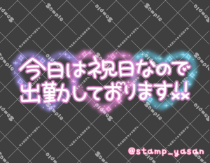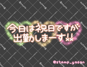 「今日は祝日なので出勤しております!!」のスタンプ 2024 2/22 2024年2月22日 0 こちらの画像はサンプルです。保存やSNS等への掲載はご遠慮ください。会員登録・ログイン後に表示される『本画像』をダウンロードしてご利用ください。 用途出勤・退勤週末・週初めのあいさつ出勤・退勤・お誘いあいさつカラータグ本日出勤祝日 本日 出勤 祝日 文字 敬語 横書き 透過 この記事が気に入ったら フォローしてね! Follow @stamp_yasan_sub Follow me! 「今日は祝日ですが出勤しまーす!!」のスタンプ 「今日は祝日ですが出勤しております!!」のスタンプ