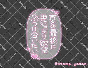 「夏の最後に思いっきり欲望ぶつけ合いたい」のスタンプ 2025 8/30 2025年8月30日 0 こちらの画像はサンプルです。保存やSNS等への掲載はご遠慮ください。会員登録・ログイン後に表示される『本画像』をダウンロードしてご利用ください。 用途季節・イベント春夏秋冬カラータグふきだし夏 ふきだし 夏 文字 タメ語 縦書き 透過 この記事が気に入ったら フォローしてね! Follow @stamp_yasan_sub Follow me! 「めちゃくちゃ恥ずかしいけど興奮しちゃう///♡」のスタンプ 「ミスヘブン初出場頑張ります わたしをあなたの力で推し上げて♡応援よろしくお願いします」のスタンプ