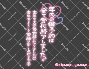 「年内の御予約は全て受付終了しました 本年も大変お世話になりました♡来年もよろしくお願い申し上げます」のスタンプ 2025 12/22 2025年12月22日 0 こちらの画像はサンプルです。保存やSNS等への掲載はご遠慮ください。会員登録・ログイン後に表示される『本画像』をダウンロードしてご利用ください。 用途空き状況・受付終了行事・イベントスケジュール・予約季節・イベントカラータグ年末年始予約状況 年末年始 予約状況 文字 敬語 縦書き 透過 この記事が気に入ったら フォローしてね! Follow @stamp_yasan_sub Follow me! 「年内空き枠残りわずか」のスタンプ 「あなたの姫納めわたしにちょーだい?」のスタンプ