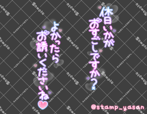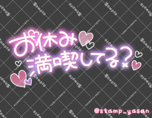 「お休み満喫してる?」のスタンプ 2025 4/30 2025年4月30日 0 こちらの画像はサンプルです。保存やSNS等への掲載はご遠慮ください。会員登録・ログイン後に表示される『本画像』をダウンロードしてご利用ください。 用途あいさつ週末・週初めのあいさつカラータグ土日祝日連休週末 土日 祝日 連休 週末 文字 タメ語 横書き 透過 この記事が気に入ったら フォローしてね! Follow @stamp_yasan_sub Follow me! 「ありがとう めちゃめちゃ楽しくてあっというまの時間でした」のスタンプ 「休日いかがおすごしですか?」「よかったらお誘いくださいね♡」のスタンプ