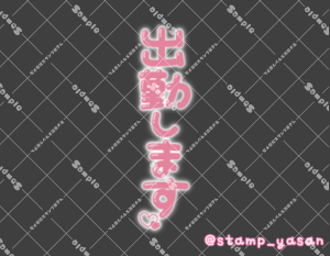 「出勤します」のスタンプ 2026 1/21 2026年1月21日 0 こちらの画像はサンプルです。保存やSNS等への掲載はご遠慮ください。会員登録・ログイン後に表示される『本画像』をダウンロードしてご利用ください。 用途出勤・退勤・お誘い出勤・退勤カラータグ出勤 出勤 文字 敬語 縦書き 透過 この記事が気に入ったら フォローしてね! Follow @stamp_yasan_sub Follow me! 「お疲れ様 みてくれてありがとう マイガール登録よろしくね」のスタンプ 「またあとでね」のスタンプ
