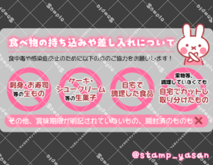 「食べ物の持ち込みや差し入れについて」のお願いスタンプ 2024 3/05 2024年3月5日 0 こちらの画像はサンプルです。保存やSNS等への掲載はご遠慮ください。会員登録・ログイン後に表示される『本画像』をダウンロードしてご利用ください。 カラータグ差し入れ注意うさぎお知らせ 差し入れ 注意 うさぎ お知らせ 文字 敬語 横書き 透過 この記事が気に入ったら フォローしてね! Follow @stamp_yasan_sub Follow me! 「大スキ 大切にしてくれてありがとう」のスタンプ 「ご卒業おめでとう 今月は制服でお出迎え」のスタンプ