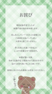 欠勤のお詫び1枚絵素材 2025 12/01 2025年12月1日 0 こちらの画像はサンプルです。保存やSNS等への掲載はご遠慮ください。会員登録・ログイン後に表示される『本画像』をダウンロードしてご利用ください。 用途おわび遅刻・欠勤・早退カラータグ本日欠勤体調不良 本日 欠勤 体調不良 文字 イラスト 敬語 横書き 1枚絵 この記事が気に入ったら フォローしてね! Follow @stamp_yasan_sub Follow me! 欠勤のお詫び1枚絵素材 「ありがとう♡」のスタンプ