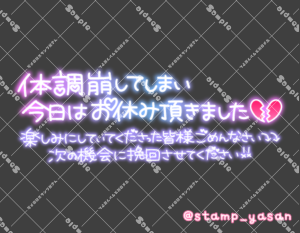 「体調崩してしまい今日はお休み頂きました 楽しみにしていてくださった皆様ごめんなさい 次の機会に挽回させてください!!」のスタンプ 2023 12/18 2023年12月18日 0 こちらの画像はサンプルです。保存やSNS等への掲載はご遠慮ください。会員登録・ログイン後に表示される『本画像』をダウンロードしてご利用ください。 用途遅刻・欠勤・早退おわびカラータグ本日欠勤体調不良 本日 欠勤 体調不良 文字 敬語 横書き 透過 この記事が気に入ったら フォローしてね! Follow @stamp_yasan_sub Follow me! 「日記読んでくれてThank You 毎日更新してます!明日もみてね」のスタンプ 「色々流行ってるからくれぐれもご自愛ください」のスタンプ