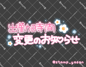 「退勤時間変更のお知らせ」のスタンプ 2023 8/02 2023年8月2日 0 こちらの画像はサンプルです。保存やSNS等への掲載はご遠慮ください。会員登録・ログイン後に表示される『本画像』をダウンロードしてご利用ください。 用途出勤・退勤スケジュール更新報告出勤・退勤・お誘いスケジュール・予約カラータグ退勤お知らせ 退勤 お知らせ 文字 敬語 横書き 透過 この記事が気に入ったら フォローしてね! Follow @stamp_yasan_sub Follow me! 「出勤時間変更のお知らせ」のスタンプ 「出勤時間変更」のスタンプ